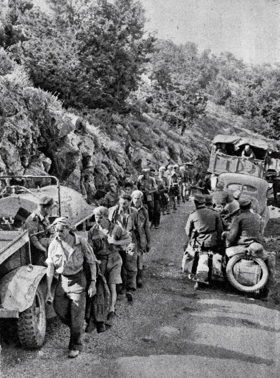 It was a march of some forty miles to the south coast. The road seemed to lead upward all the way, with interminable zigzags, hairpin bends, and over mountain ridges reaching 3000 feet. To men who were fresh and fit this would have been a physical effort of some magnitude. But to the Kiwis, Australians, and British troops who were exhausted from lack of sleep, short of food and water, defeated by the weight and shock of never-ending air attack, whose courage had been futile in the absence of adequate fighting equipment, here was the culminating ordeal. To fall behind was to be taken prisoner. To continue ahead was to drive the body to unattainable lengths of endurance. The road was littered with abandoned equipment of all kinds. The dead lay there too. The wounded, the weak, the ones who fell out, lay with them. Some even struggled onwards on hands and knees.