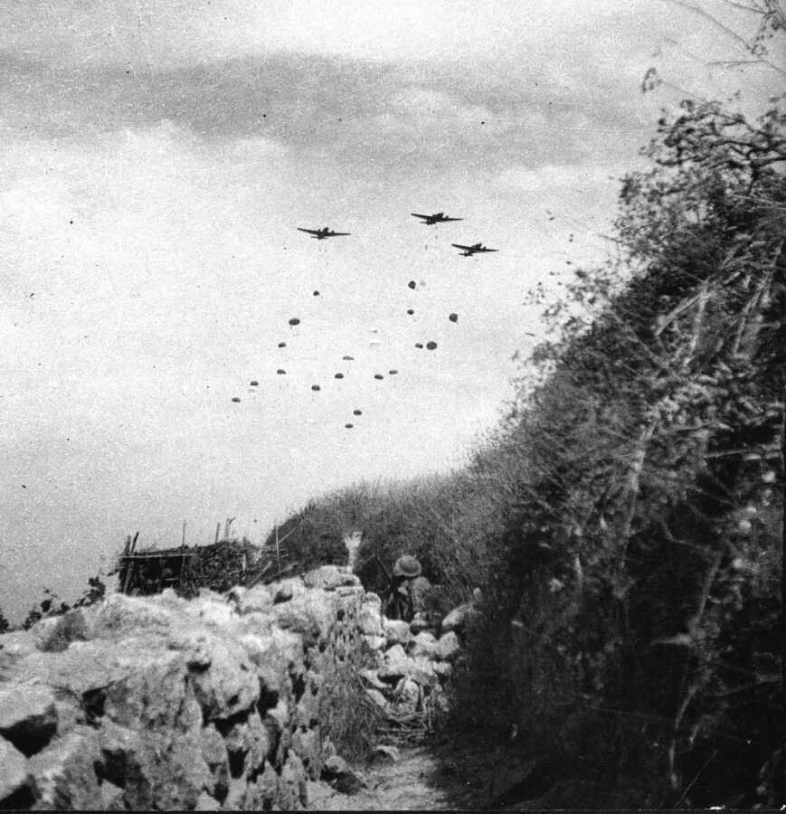 During the day more German paratroopers landed unexpectedly over the 28th Maori Battalion. Many men were killed in the air or while undoing their harness. An Australian solider recalls “The Māori troops down on the left go into a bayonet charge and the noise of their yells and the Germans screaming chills the blood.”